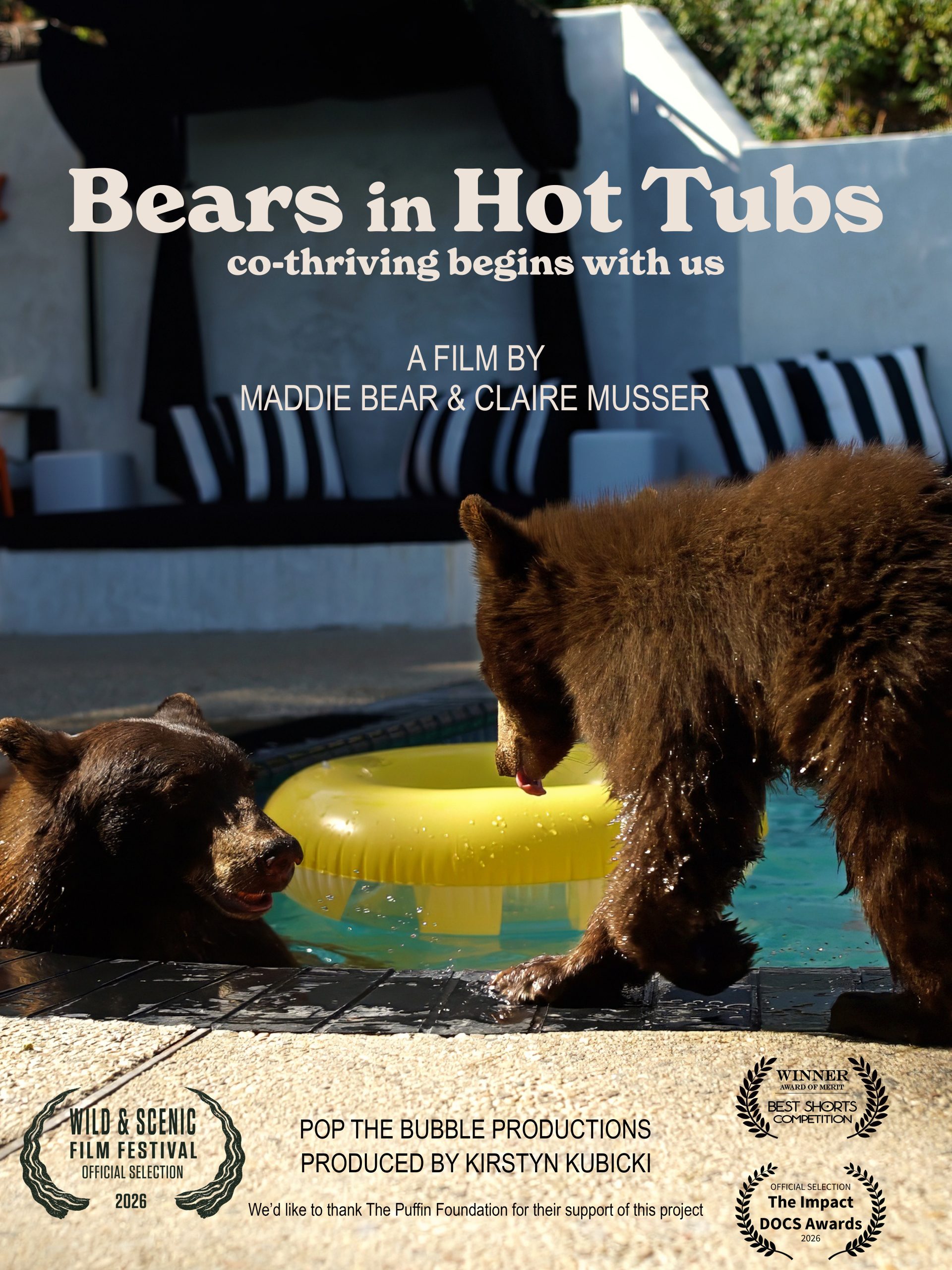 These ideas took visual and narrative form through the short documentary Bears in Hot Tubs, which extends the co-thriving framework into urban space. The film reimagines how black bears navigate human-dominated neighborhoods, using animal-led visual storytelling to explore how attentiveness, restraint, and responsibility can guide human behavior across species boundaries.